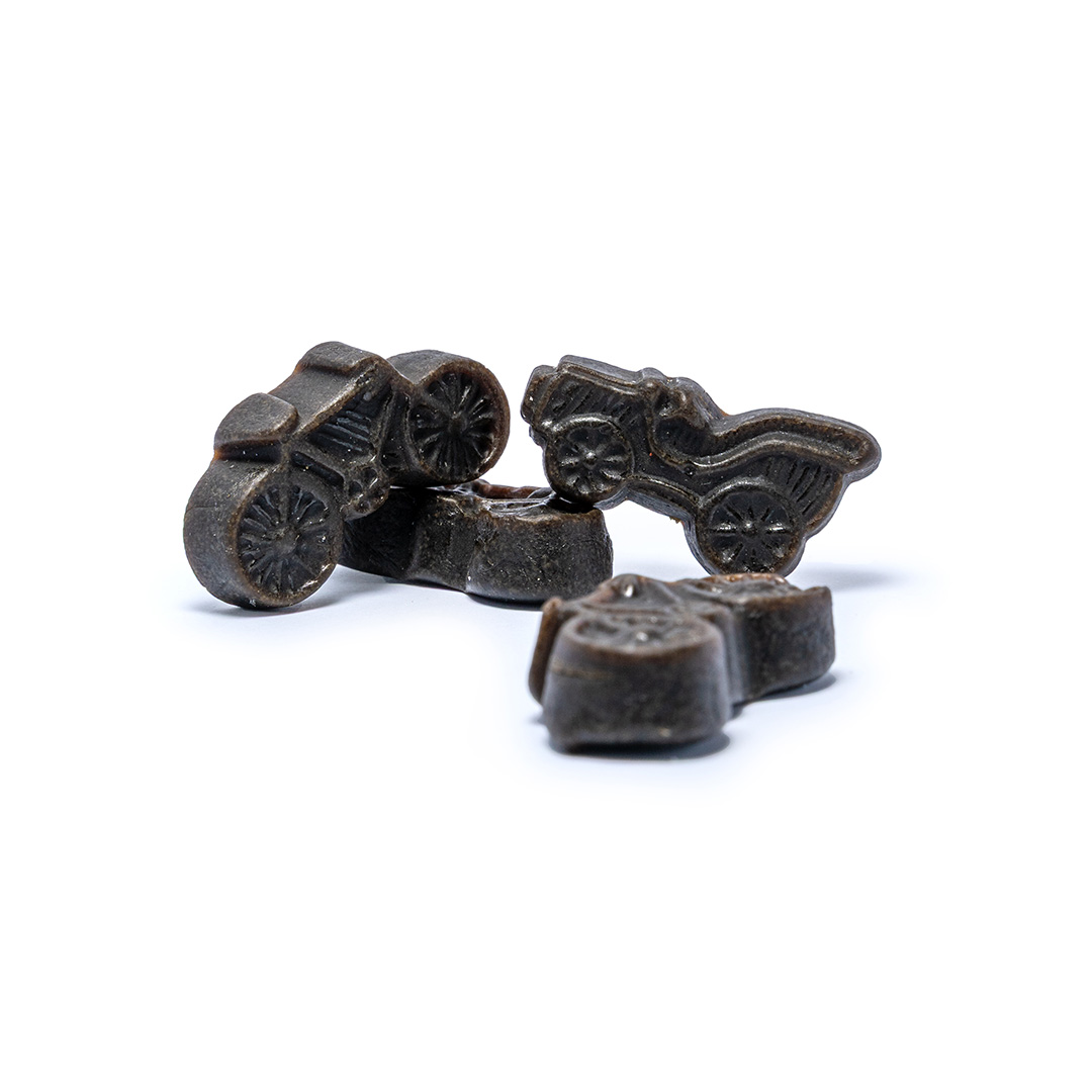Zucker, Glukosesirup, Weizenstärke, Wasser, Melasse, modifizierte Maisstärke, Süssholz-Extrakt, Ammoniumchlorid, Farbstoff (E153), Aroma, Pflanzenöl (Kokosnuss), Überzugsmittel (Carnaubawachs). Nährwerte pro 100g: 1398 kJ/329 kcal, 81 g Kohlenhydrate (davon 52 g Zucker), 0,5 g Eiweiß, 0,5 g Fett (davon 0,3g gesättigt) und 0,08 g Salz